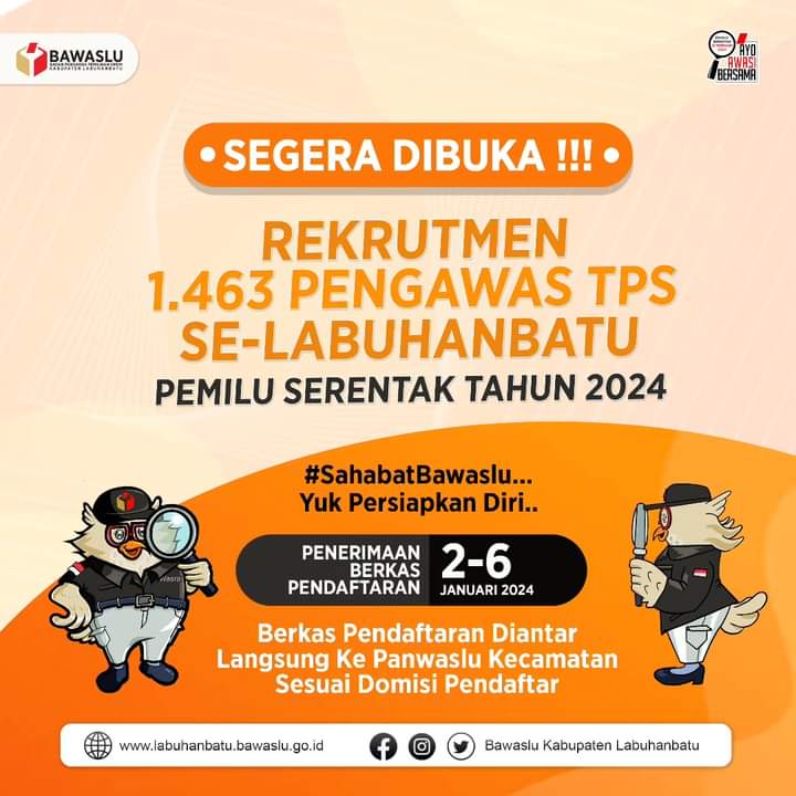 “Untuk info lebih lanjut, bisa mengunjungi media sosial Bawaslu Labuhanbatu atau mendatangi masing-masing kantor Panwascam di setiap kecamatan. Karena, perekrutan berada di sana,” pintanya lagi.