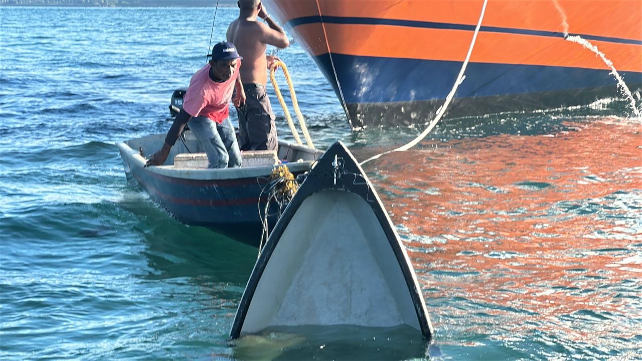 Katapublik Batam, Bakamla RI melalui unsur KN. Tanjung Datu-301 berhasil mengevakuasi 3 nelayan yang mengalami kecelakaan akibat terhantam gelombang arus kalang palang batu berhenti sehingga kapal nelayan terbalik di Perairan Batu Berhenti Batam, Kamis (3/10/2024)