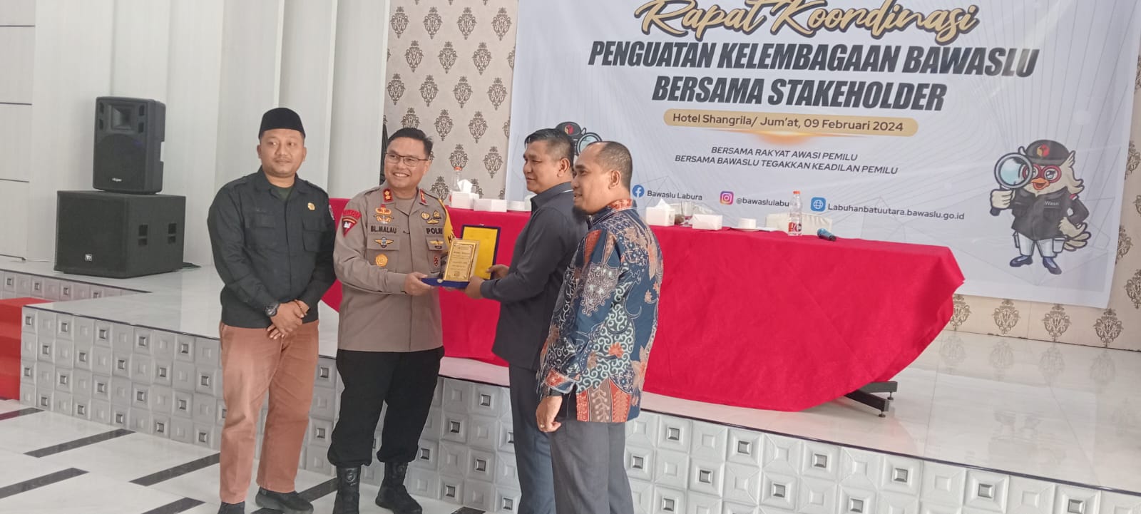 Di akhir acara Bawaslu Labura memberikan cindramata berupa Plakat kepada Kapolres Labuhanbatu.