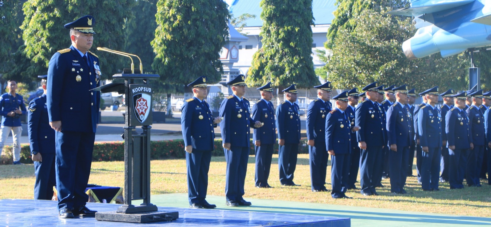 Bertindak selaku Inspektur Upacara (Irup) Kepala Staf Komando Operasi Udara (Kaskoopsud) ll, Marsma TNI Azhar Aditama Djojosugito.
