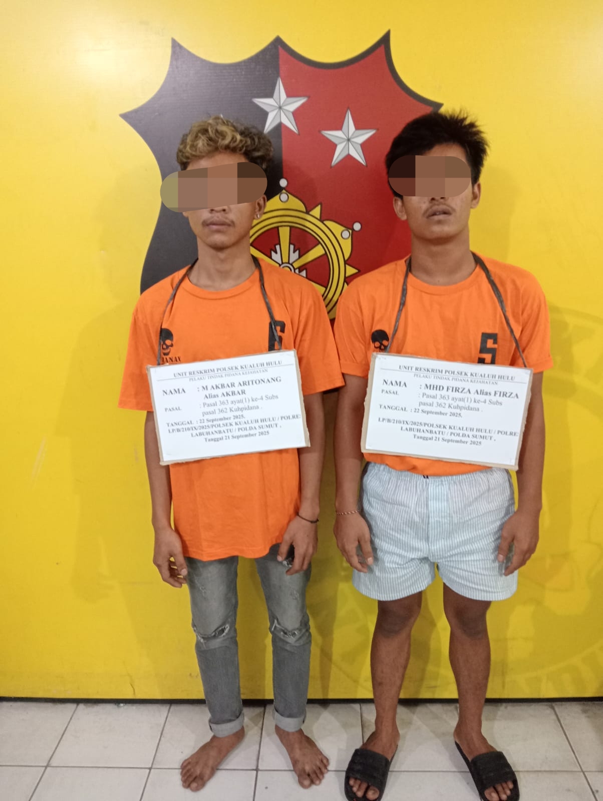 Kapolsek Kualuh Hulu, AKP Nelson Silalahi, SH, MH, melalui Kanit Reskrim Ipda Ramadhan Hilal, SE, menjelaskan bahwa kedua pelaku yang ditangkap adalah Muhammad Firza alias Firza (18), warga Jalan Pejuang 45, Kelurahan Aek Kanopan, dan M. Akbar Aritonang alias Akbar (22), warga Gunting Saga, Kecamatan Kualuh Selatan.
