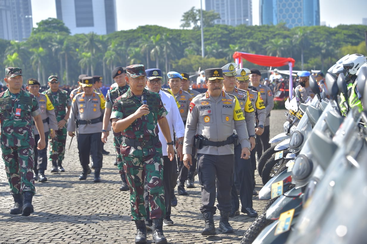 Katapublik Jakarta, Kepala Staf Umum (Kasum) TNI Letnan Jenderal TNI Bambang Ismawan, bersama Wakapolri Komjen Pol Agus Andrianto memimpin Apel Gelar Pasukan operasi “Lilin-2023”, yang diikuti oleh Pasukan TNI-Polri dan Kementerian/Lembaga, berlangsung di Lapangan Silang Monas, Jakarta Pusat. Kamis, (21/12/2023).