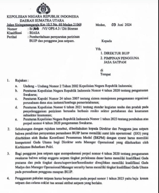 Karena itu, bagi pengguna jasa Satpam agar mempedomani perpol nomor 4 tahun 2020, tentang pengaman Swakarsa yang artinya, bahwa setiap anggota Satpam tingkat pelaksana dasar harus memiliki kualifikasi Gada Pratama dan Gada madya bagi Komandan Regu (DANRU) dan CIP di perusahaan pengguna maupun BUJP. Serta, pakaian Satpam harus berpedoman pada Perpol nomor 4 tahun 2020 dan Surat Edaran Polda Sumut yaitu baju kraem Satpam dan celana coklat tua sesuai atribut satpam yang berlaku.