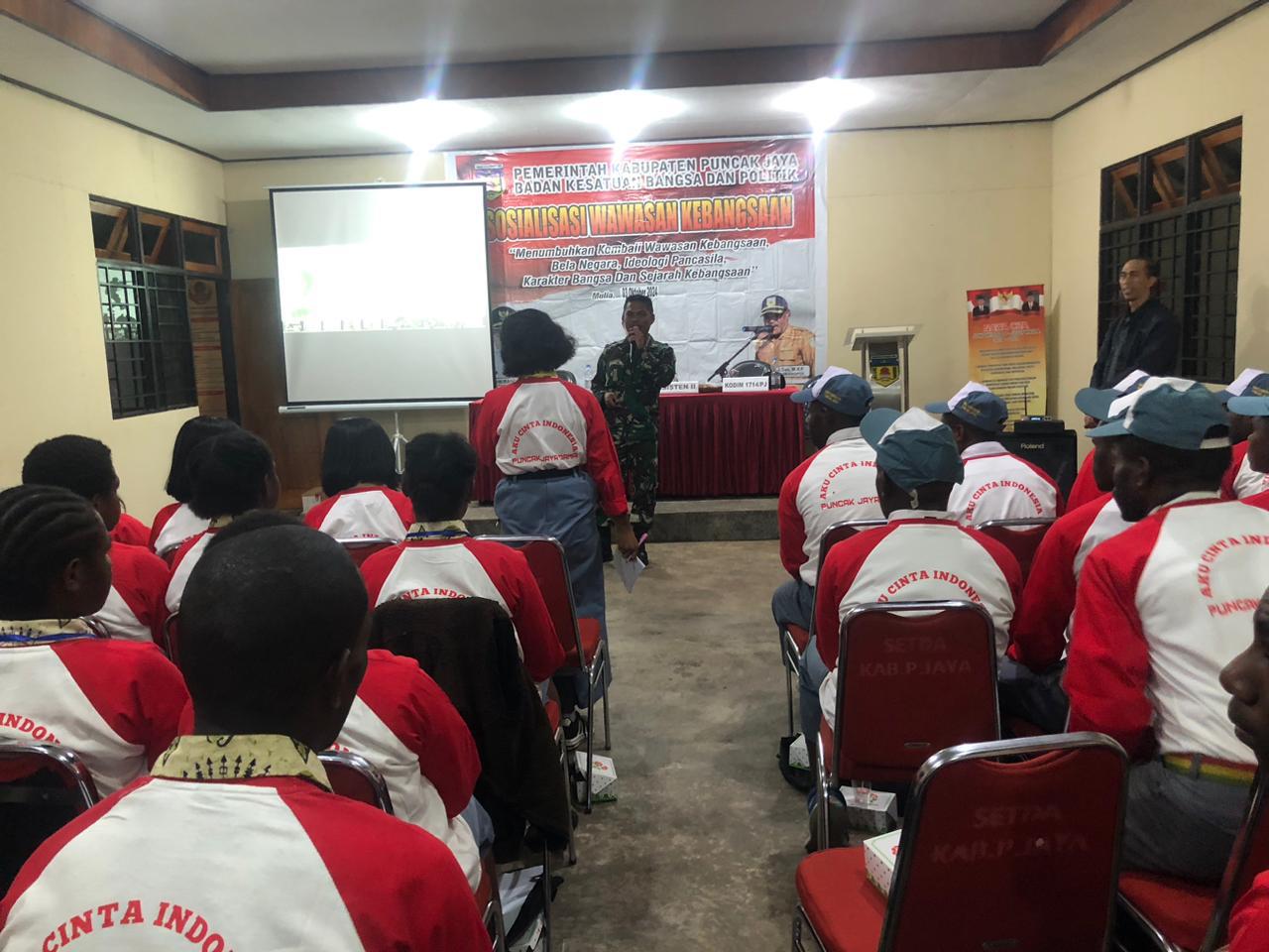 Katapublik Mulia, Bertempat di aula Kantor Kesbang Pol Kab. Puncak Jaya Provinsi Papua Tengah, Letda Inf Fransisco (Danramil 1714-01/Mulia) dan beberapa Anggota Babinsa memberikan Materi Wawasan Kebangsaan dan Cinta Tanah Air kepada Siswa-siswi baru SMA dan SMK Mulia, Senin (14/10/2024).