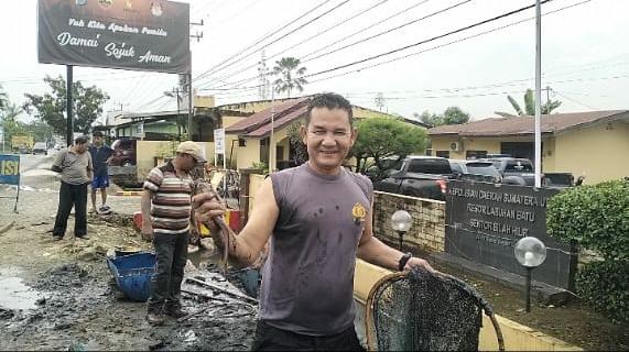 “Sabtu kemarin, kita panen lele didepan kantor bersama kawan-kawan personel lainnya dan hasilnya kita bagikan kepada warga sekitar yang sedang berpuasa di Bulan Suci Ramadhan bang”, ujar Kapolsek.