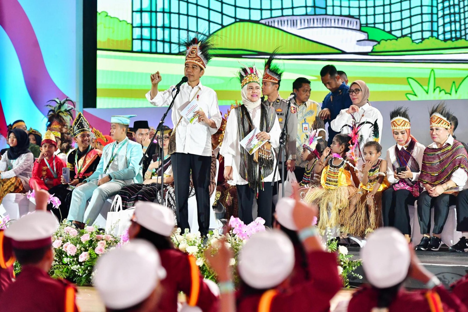 Katapublik Jayapura, Panglima TNI Jenderal TNI Agus Subiyanto mendampingi Presiden Joko Widodo pada acara puncak peringatan Hari Anak Nasional (HAN) ke-40 yang mengusung tema “Suara Anak Membangun Bangsa”, bertempat di Istora Papua Bangkit, Kabupaten Jayapura, Provinsi Papua, Selasa (23/7/2024).