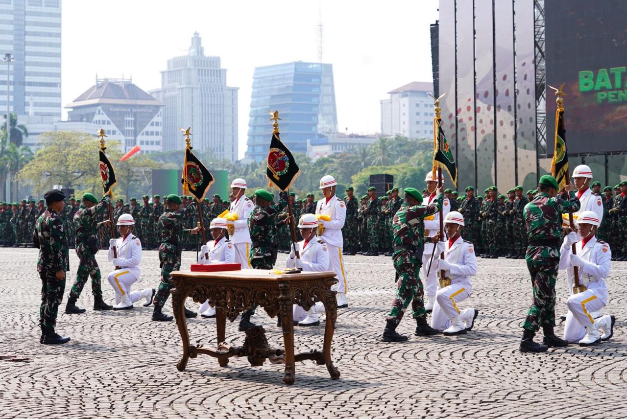 Katapublik Jakpus, Panglima TNI Jenderal TNI Agus Subiyanto meresmikan Batalyon Infanteri Penyangga Daerah Rawan (PDR) di wilayah Papua, bertempat di Lapangan Silang Monas, Jakarta Pusat, Rabu (02/10/2024).
