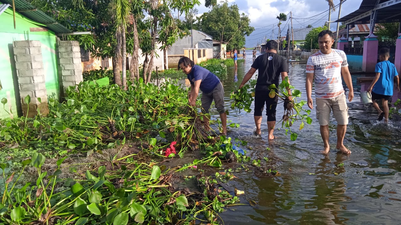 Katapublik Limboto, Dewan Pimpinan Cabang (DPC) Pro Jurnalismedia Siber (PJS) Kabupaten Gorontalo bersama personel Polsek Limboto bahu membahu membersihkan sampah dan eceng gondok di sekitar rumah warga yang terdampak luapan air Danau Limboto di Kelurahan Hunggaluwa, Jum’at (19/07/2024).
