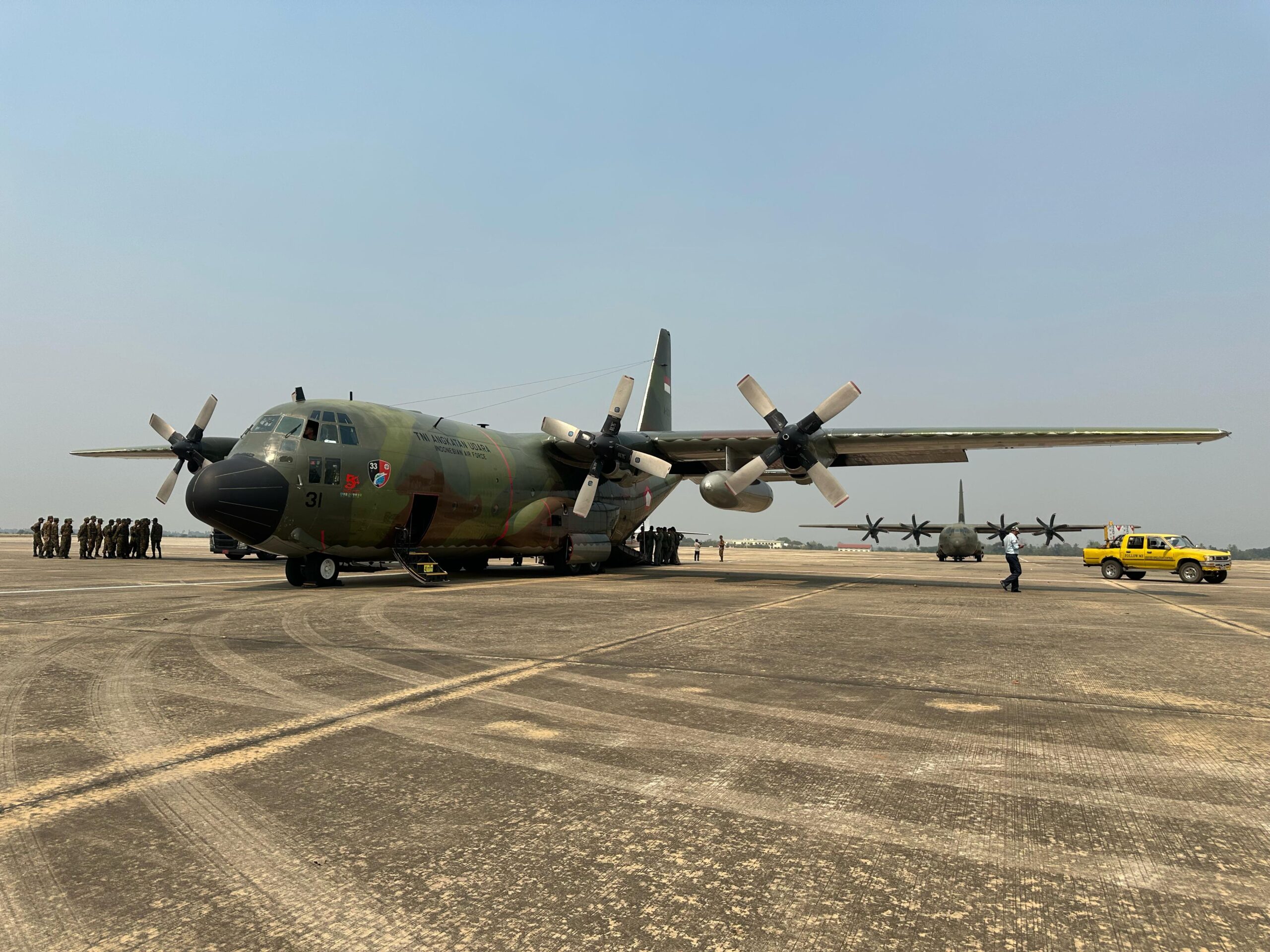 Katapublik Myanmar, Pesawat TNI AU Hercules C-130 dari Skadron Udara 33 Lanud Sultan Hasanuddin, yang membawa bantuan kemanusiaan dari pemerintah Indonesia seberat 10.446 kg untuk korban gempa bumi di Myanmar mendarat di Bandara Nay Pyi Taw Myanmar, Rabu (2/4/2025).