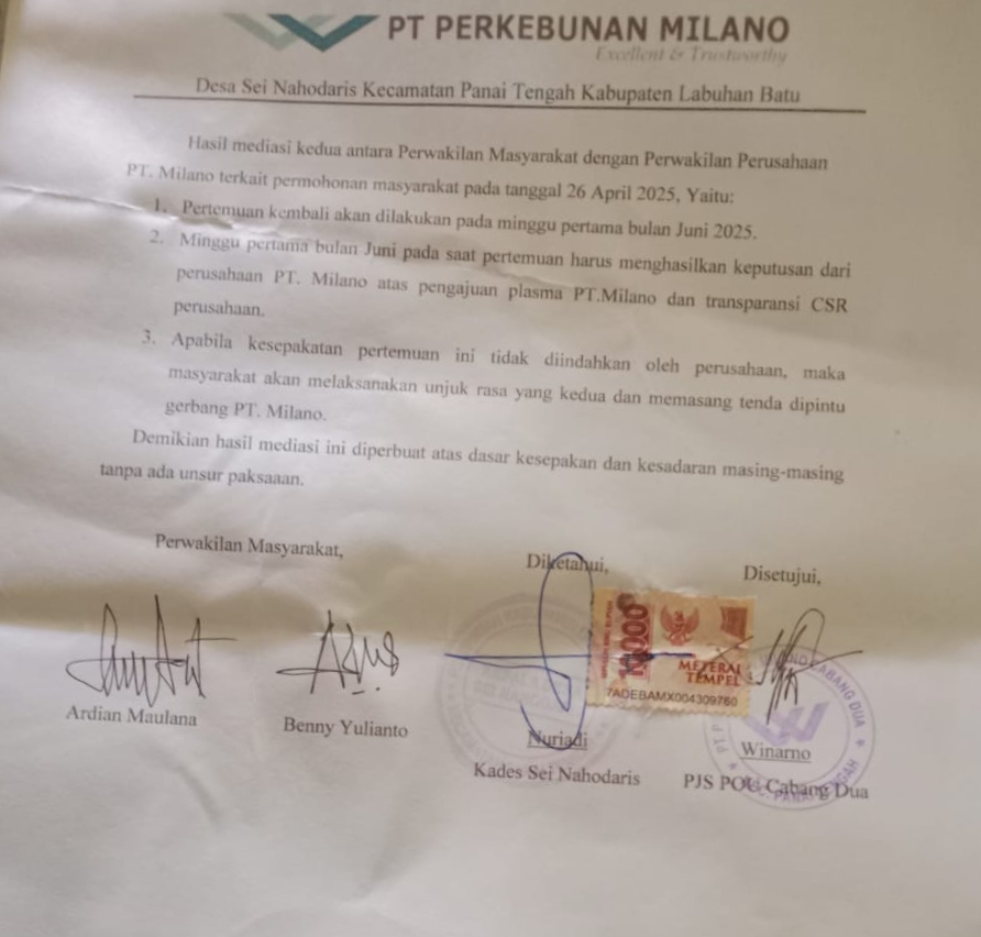 Katapublik Labuhanbatu, Warga Desa Seina Hodaris, Kecamatan Panai Tengah, Kabupaten Labuhanbatu menyampaikan keluhan terkait aktivitas PT Perkebunan Milano Cabang Dua Estate yang dinilai tidak memenuhi kewajiban terhadap masyarakat sekitar. Salah satu tuntutan utama adalah soal kebun plasma yang belum pernah disalurkan sejak perusahaan berdiri.