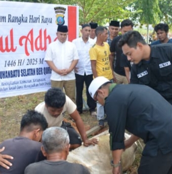 Katapublik Labusel, Dalam rangka memperingati Hari Raya Idul Adha 1446 H/2025 M, Polres Labuhanbatu Selatan melaksanakan pemotongan hewan kurban di halaman Mapolres yang berlokasi di Jalan Lintas Sumatera Kotapinang, Gunung Tua, Desa Sosopan, Kecamatan Kotapinang, Kabupaten Labuhanbatu Selatan. Jumat, (6/6/2025).
