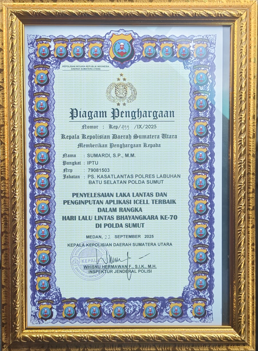 Katapublik Labusel, Prestasi membanggakan kembali ditorehkan oleh Satuan Lalu Lintas Polres Labuhanbatu Selatan. Kepala Satuan Lalu Lintas (Kasat Lantas) Polres Labusel, Iptu Sumardi, S.P., M.M., menerima penghargaan langsung dari Kapolda Sumatera Utara atas keberhasilannya dalam penyelesaian kasus kecelakaan lalu lintas serta penginputan data aplikasi I-Cell terbaik.