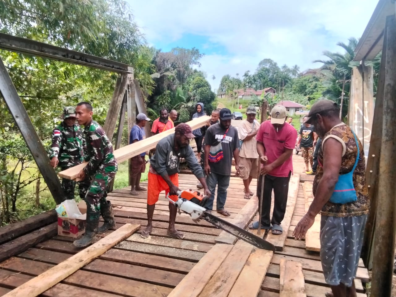 Dalam rangka meningkatkan kesejahteraan masyarakat dan mempermudah mobilitas penduduk, Satgas Yonif 126/KC mengambil langkah cepat dengan turun langsung ke lokasi perbaikan. Prajurit dari Satgas Yonif 126/KC bekerja sama dengan masyarakat setempat, menggali, menata, dan membangun kembali bagian-bagian jembatan yang rusak. Dengan semangat gotong royong, mereka berhasil menyelesaikan sebagian besar pekerjaan dalam waktu singkat.